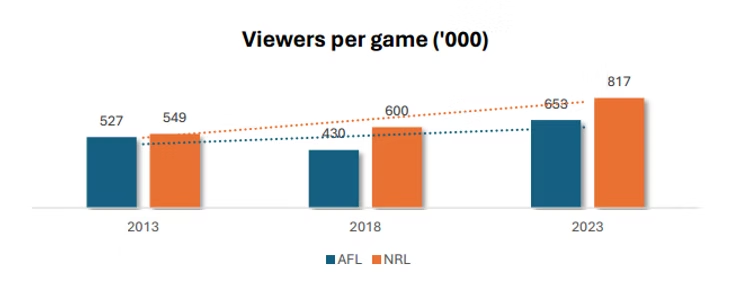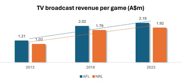 It doesn’t seem that long ago that the AFL were shouting from the rooftops about their $1.25b Australian-record 5-yr TV rights deal, a fraction over $250m per season. That was 2011, and at that time it was a 60% increase in broadcast revenue from the previous deal struck 5 years earlier. It is quite remarkable to think that since then, broadcast figures have only continued to sky-rocket, with the AFL generating $473m from broadcast revenue in 2023, or $2.19m per game (vs $1.21m in 2013). Not to be outdone is the NRL, just behind the AFL at $1.92m per NRL game in 2023. NRL figures are also nearly double what they were 10 years ago. These figures will no doubt please AFL and NRL executives alike.
